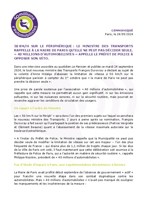 Dans une interview accordée au quotidien Le Parisien et publiée ce mardi 24 septembre 2024, le tout nouveau ministre des Transports François Durovray a déclaré au sujet de la volonté d’Anne Hidalgo d’abaisser la limitation de vitesse à 50 km/h sur le périphérique parisien à compter du 1er octobre que « la maire de Paris ne peut pas prendre la décision seule ». Une prise de parole soutenue par l’association « 40 millions d’automobilistes », qui rappelle que cette mesure ne permettrait aucun gain significatif, ni sur les émissions polluantes, ni sur les nuisances sonores, ni sur la sécurité routière, mais pourrait en revanche aggraver les conditions de circulation des usagers.