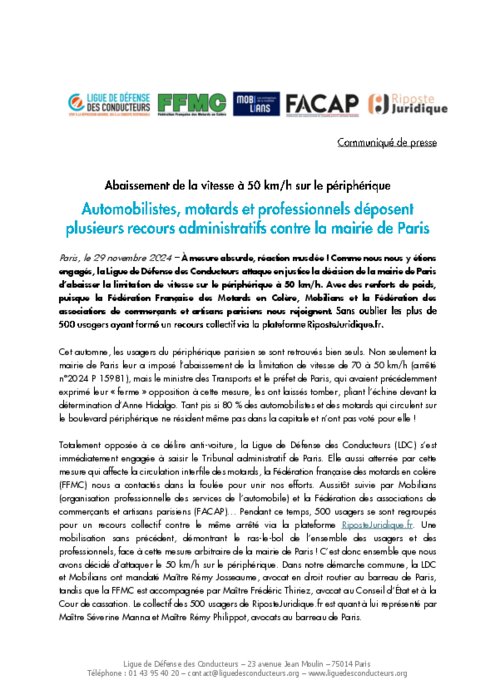 La Ligue de Défense des Conducteurs attaque en justice la décision de la mairie de Paris d’abaisser la limitation de vitesse sur le périphérique à 50 km/h. Avec des renforts de poids, puisque la Fédération Française des Motards en Colère, Mobilians et la Fédération des associations de commerçants et artisans parisiens nous rejoignent. Sans oublier les plus de 500 usagers ayant formé un recours collectif via la plateforme RiposteJuridique.fr.