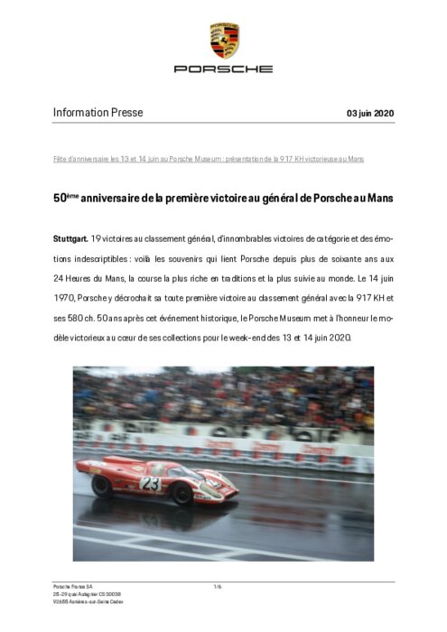 Le 14 juin 1970, Porsche décrochait sa toute première victoire au classement général des 24 Heures du Mans avec la 917 KH et ses 580 ch. 50 ans après cet événement historique, le Porsche Museum met à l’honneur le modèle victorieux au cœur de ses collections pour le week-end des 13 et 14 juin 2020.