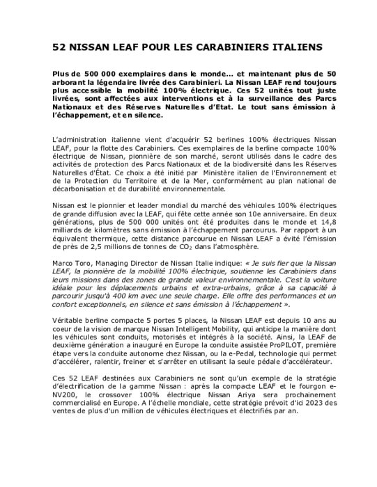 Plus de 500 000 exemplaires dans le monde... et maintenant plus de 50 arborant la légendaire livrée des Carabinieri. La Nissan LEAF rend toujours plus accessible la mobilité 100% électrique. Ces 52 unités tout juste livrées, sont affectées aux interventions et à la surveillance des Parcs Nationaux et des Réserves Naturelles d'Etat. Le tout sans émission à l'échappement, et en silence.