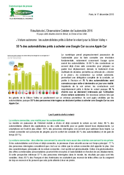 La voiture autonome, permettant une délégation complète de la conduite, se profile à l’horizon et 75 % des automobilistes sont convaincus que celle-ci deviendra un jour une réalité. Impatients de la voir arriver, les conducteurs sont majoritairement prêts à lâcher le volant puisque 55 % d’entre eux se déclarent intéressés par l’utilisation d’une voiture autonome.