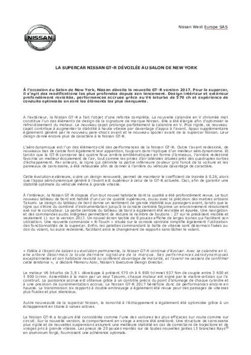 À l’occasion du Salon de New York, Nissan dévoile la nouvelle GT-R version 2017. Pour la supercar, il s’agit des modifications les plus profondes depuis son lancement. Design intérieur et extérieur profondément revisités, performances accrues grâce au V6 biturbo de 570 ch et expérience de conduite optimisée en sont les éléments les plus marquants.