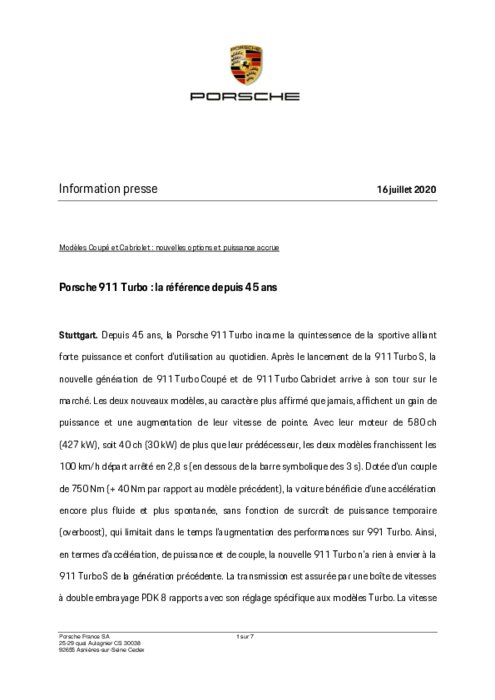 Depuis 45 ans, la Porsche 911 Turbo incarne la quintessence de la sportive alliant forte puissance et confort d’utilisation au quotidien. Après le lancement de la 911 Turbo S, la nouvelle génération de 911 Turbo Coupé et de 911 Turbo Cabriolet arrive à son tour sur le marché. Les deux nouveaux modèles, au caractère plus affirmé que jamais, affichent un gain de puissance et une augmentation de leur vitesse de pointe...