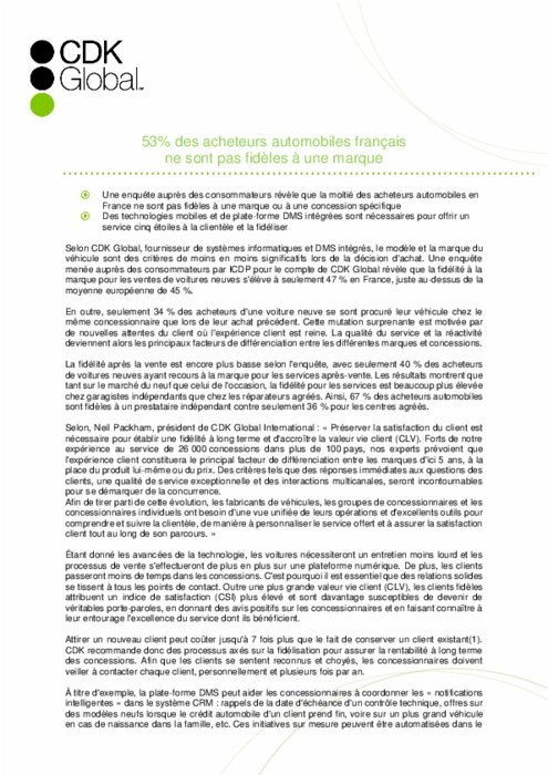 Selon CDK Global, seulement 40% des acheteurs de voitures neuves ayant recours à la marque pour les services après-vente. Les résultats de l'étude montrent que tant sur le marché du neuf que celui de l'occasion, la fidélité pour les services est beaucoup plus élevée chez les garagistes indépendants que chez les réparateurs agréés. Ainsi, 67% des acheteurs automobiles sont fidèles à un prestataire indépendant contre seulement 36% pour les centres agréés.
