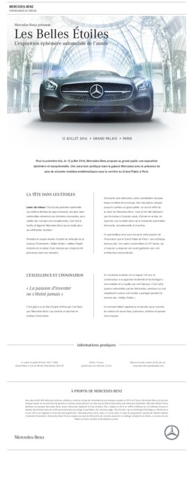 Pour la première fois, le 12 juillet 2016, Mercedes-Benz propose au grand public une exposition éphémère et exceptionnelle. Une excursion poétique dans la galaxie Mercedes avec la présence de plus de soixante modèles emblématiques sous la verrière du Grand Palais à Paris.