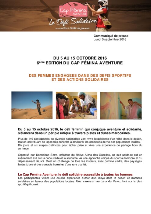 Du 5 au 15 octobre 2016, le défi féminin qui conjugue aventure et solidarité, s'élancera dans un périple unique à travers pistes et dunes marocaines. Plus de 140 participantes de diverses nationalités vont vivre l'expérience d'un rallye dans le désert, tout en contribuant de façon très concrète à améliorer les conditions de vie des populations locales. Dix jours et six étapes distinctes pour lâcher prise et vivre une expérience de partage hors du commun.