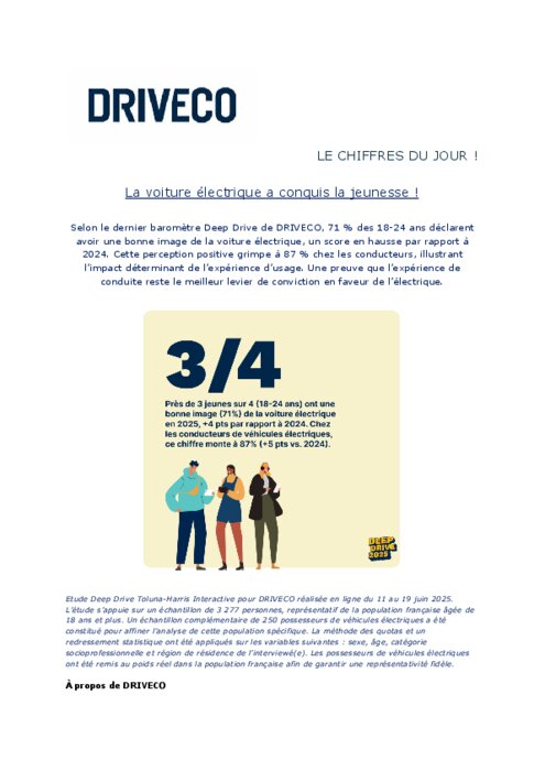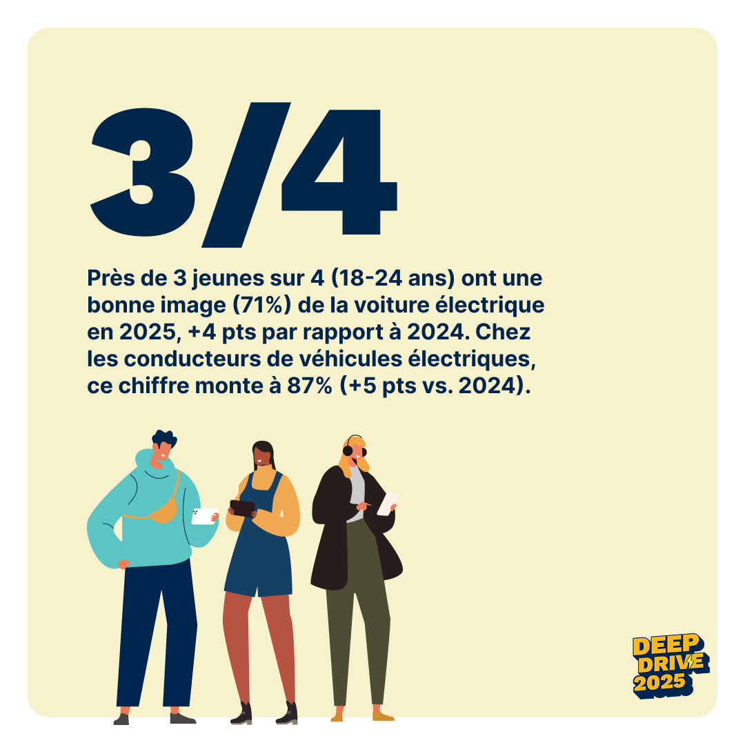 Selon le dernier baromètre Deep Drive de Driveco, 71 % des 18-24 ans déclarent avoir une bonne image de la voiture électrique, un score en hausse par rapport à 2024. Cette perception positive grimpe à 87 % chez les conducteurs, illustrant l’impact déterminant de l’expérience d’usage. Une preuve que l’expérience de conduite reste le meilleur levier de conviction en faveur de l’électrique.