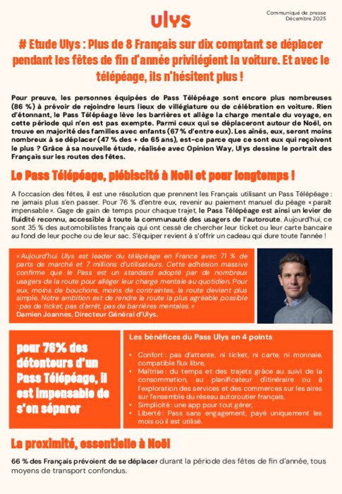 Pour preuve, les personnes équipées de PassTélépéage sont encore plus nombreuses (86 %) à prévoir de rejoindre leurs lieux de villégiature ou de célébration en voiture. Rien d’étonnant, le PassTélépéage lève les barrières et allège la charge mentale du voyage, en cette période qui n’en est pas exempte. Parmi ceux qui se déplaceront autour de Noël, on trouve en majorité des familles avec enfants (67 % d’entre eux). Les aînés, eux, seront moins nombreux à se déplacer (47 % des + de 65 ans), est-ce parce que ce sont eux qui reçoivent le plus ? Grâce à sa nouvelle étude, réalisée avec Opinion Way, Ulysdessine le portrait des Français sur les routes des fêtes.