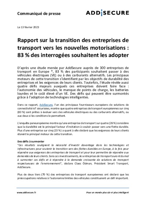 D’après une étude menée par AddSecure auprès de 300 entreprises de transport en Europe, 83 % des participants souhaitent passer à des véhicules électriques (VE) ou à des carburants alternatifs. Les principaux moteurs de cette transition s’identifient par les objectifs de durabilité des entreprises et les exigences de leurs clients.