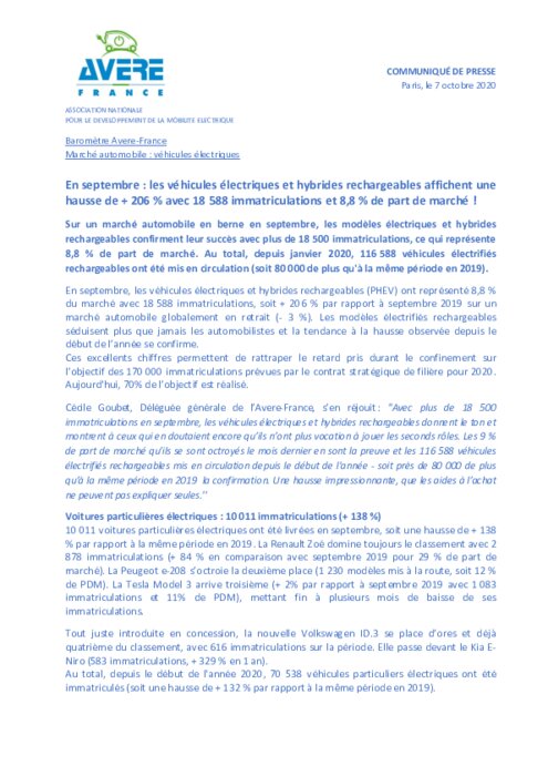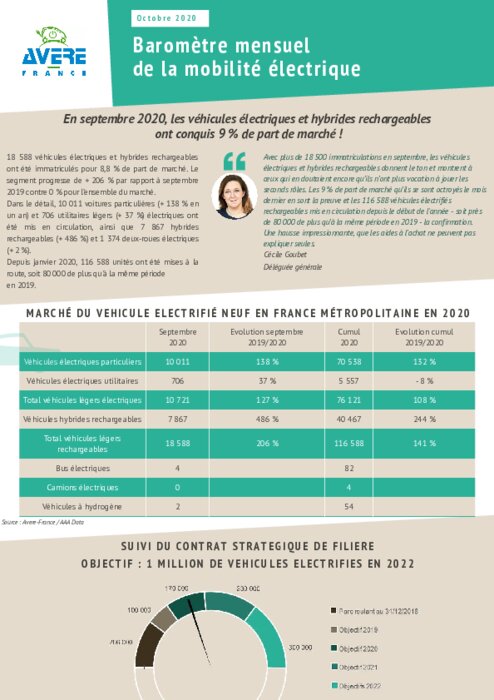 Sur un marché automobile en berne en septembre, les modèles électriques et hybrides rechargeables confirment leur succès avec plus de 18 500 immatriculations, ce qui représente 8,8 % de part de marché. Au total, depuis janvier 2020, 116 588 véhicules électrifiés rechargeables ont été mis en circulation (soit 80 000 de plus qu'à la même période en 2019).