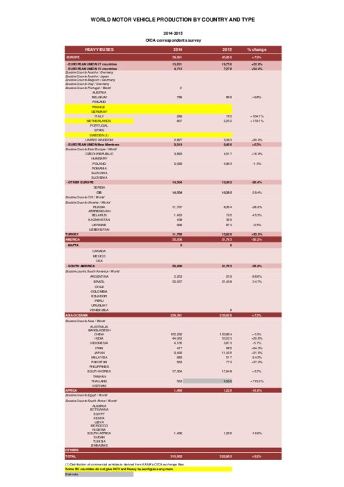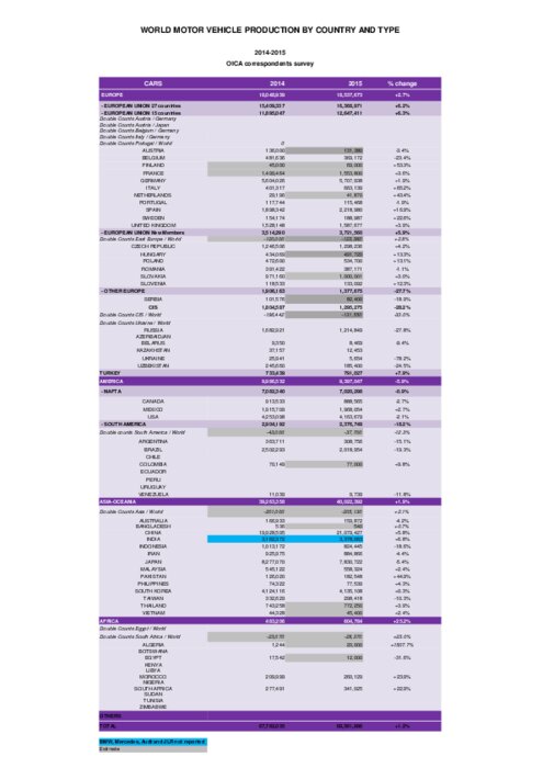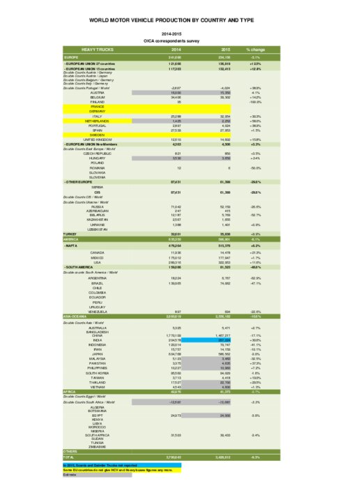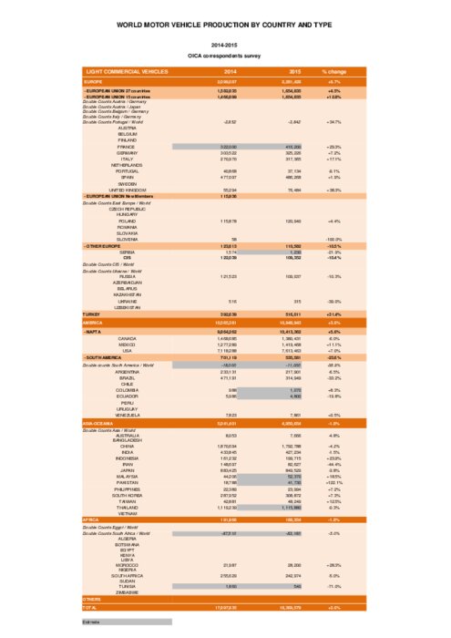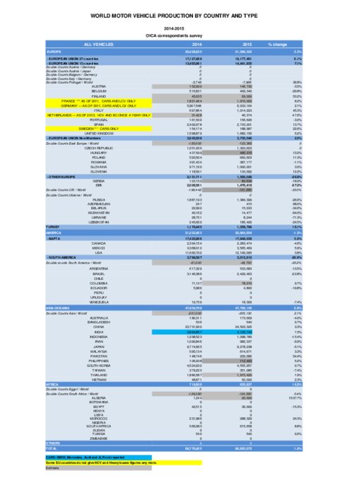 Pays par pays et par catégories de véhicules (VL, VUL, PL, cars & bus et cumul), l'Organisation Internationale des Constructeurs d’Automobiles (OICA) vient de publier toutes les statistiques détaillées de la production mondiale de véhicules en 2015. 47,786 millions ont été produits en Asie-Océanie (dont la moitié en Chine !), 20,964 millions sur le continent américain, 21,096 millions en Europe et... 0,835 millions en Afrique. C'est 1% de plus qu'en 2014...
