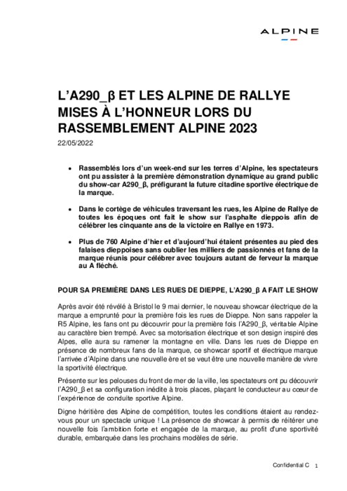 Rassemblés lors d’un week-end sur les terres d’Alpine, les spectateurs ont pu assister à la première démonstration dynamique au grand public du show-car A290_β, préfigurant la future citadine sportive électrique de la marque. Dans le cortège de véhicules traversant les rues, les Alpine de Rallye de toutes les époques ont fait le show sur l’asphalte dieppois afin de célébrer les cinquante ans de la victoire en Rallye en 1973.