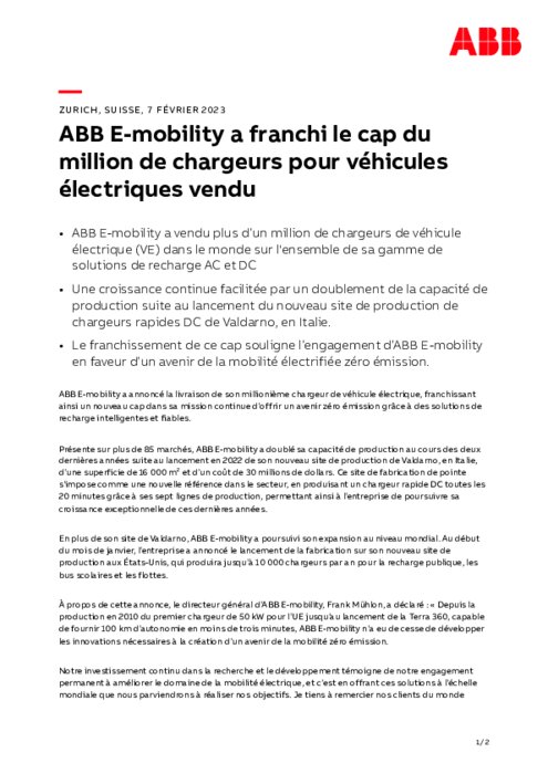 ABB E-mobility a annoncé la livraison de son millionième chargeur de véhicule électrique, franchissant ainsi un nouveau cap dans sa mission continue d'offrir un avenir zéro émission grâce à des solutions de recharge intelligentes et fiables.