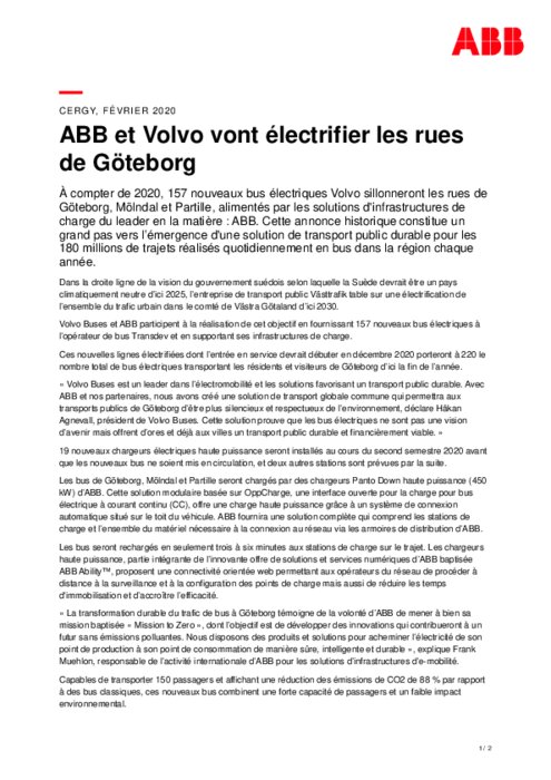 À compter de 2020, 157 nouveaux bus électriques Volvo sillonneront les rues de Göteborg, Mölndal et Partille, alimentés par les solutions d'infrastructures de charge du leader en la matière : ABB. Cette annonce historique constitue un grand pas vers l’émergence d'une solution de transport public durable pour les 180 millions de trajets réalisés quotidiennement en bus dans la région chaque année.