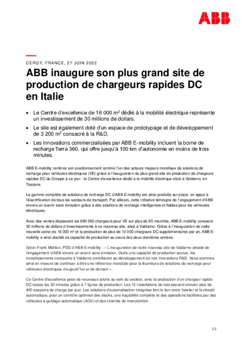 ABB E-mobility renforce son positionnement comme l’un des acteurs majeurs mondiaux de solutions de recharge pour véhicules électriques (VE) grâce à l’inauguration du plus grand site de production de chargeurs rapides DC du Groupe à ce jour : le Centre d’excellence dédié à la mobilité électrique situé à Valdarno, en Toscane.