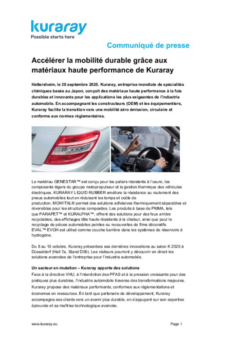 Kuraray, entreprise mondiale de spécialités chimiques basée au Japon, conçoit des matériaux haute performance à la fois durables et innovants pour les applications les plus exigeantes de l’industrie automobile. En accompagnant les constructeurs (OEM) et les équipementiers, Kurarayfacilite la transition vers une mobilité zéro émission, circulaire et conforme aux normes réglementaires.