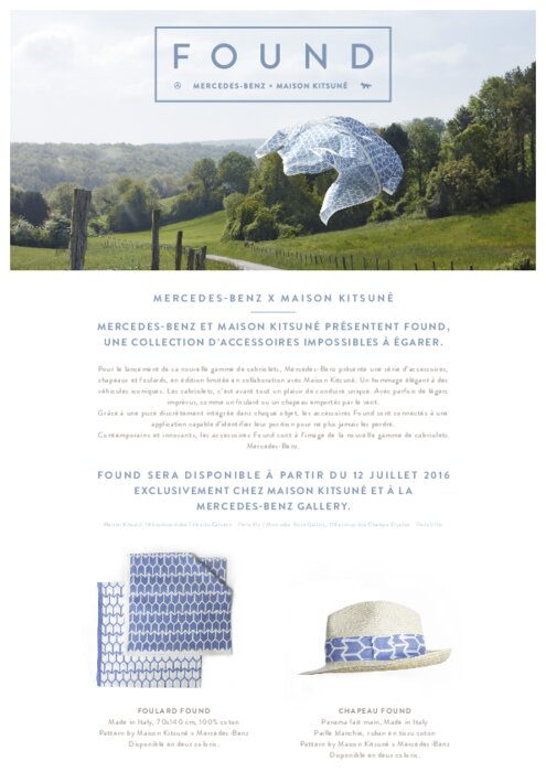 Pour le lancement de sa nouvelle gamme de cabriolets, Mercedes-Benz présente une série d’accessoires, chapeaux et foulards, en édition limitée en collaboration avec Maison Kitsuné. Un hommage élégant à des véhicules iconiques. Les cabriolets, c’est avant tout un plaisir de conduire unique. Avec parfois de légers imprévus, comme un foulard ou un chapeau emportés par le vent.