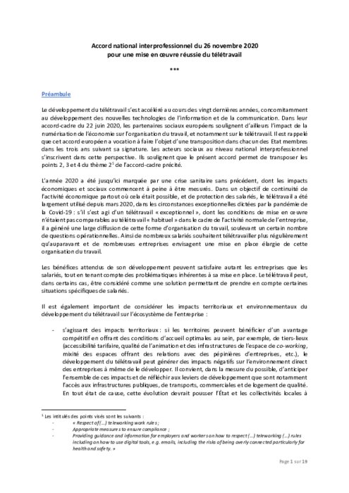 Il n'est ainsi ni normatif ni prescriptif, le texte étant conçu comme un code de bonne conduite opérationnel. Parmi les points importants, on peut noter le double volontariat (de l'employeur et du salarié) ou la réversibilité - qui permet à un salarié de revenir sur son lieu de travail si le télétravail ne lui convient pas.
