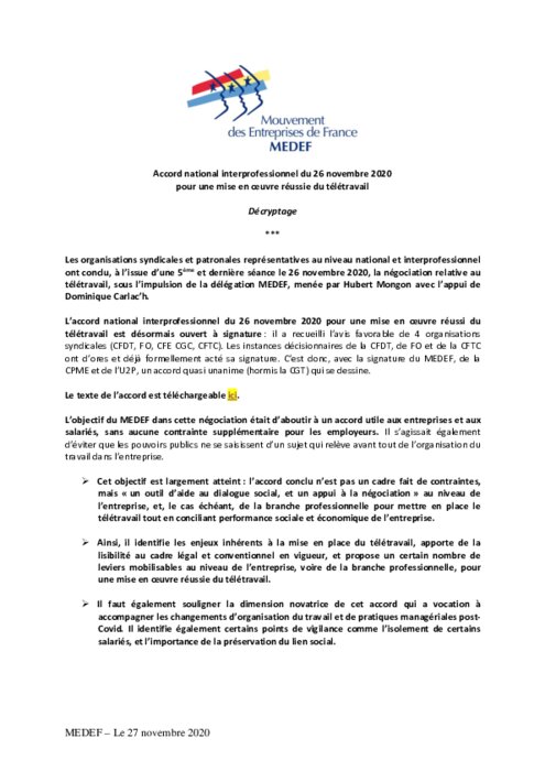 Vous trouverez en pj le texte de l'accord, ainsi qu'une note de décryptage effectuée par le MEDEF, que je vous invite à parcourir.