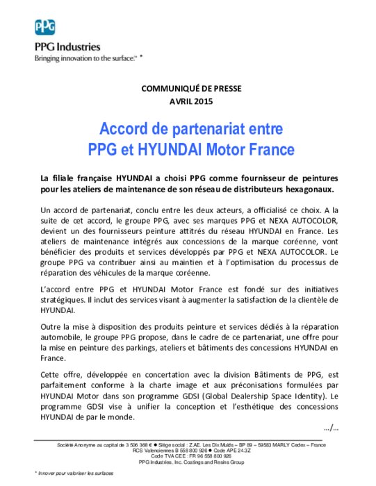 Un accord de partenariat, conclu entre les deux acteurs, a officialisé ce choix. A la suite de cet accord, le groupe PPG, avec ses marques PPG et NEXA AUTOCOLOR, devient un des fournisseurs peinture attitrés du réseau HYUNDAI en France.