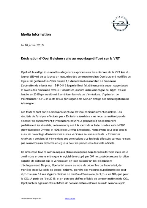 La chaîne flamande VRT avait affirmé lundi qu'Opel faisait procéder par ses concessionnaires à une mise à jour de logiciel sur la Zafira Tourer 1.6 diesel, "sans toutefois informer le propriétaire du véhicule sur la nature de cette mise à jour".