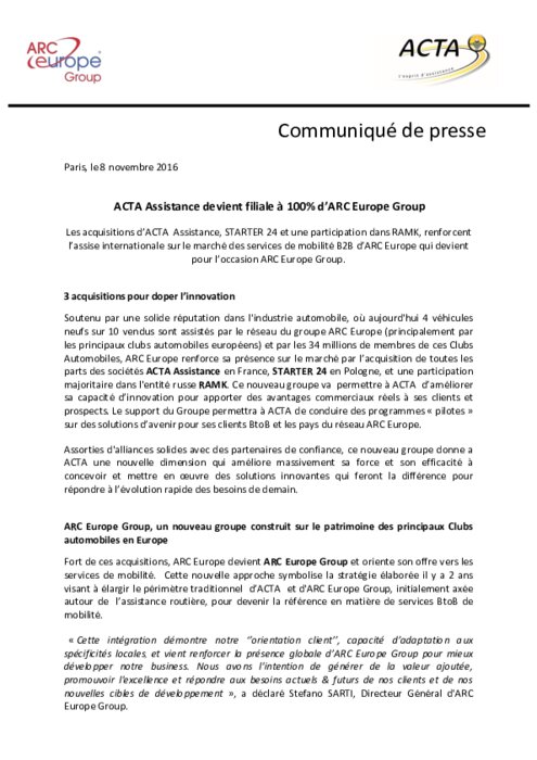 Services 08 novembre 2016 - 15:56 Les acquisitions d’ACTA Assistance, STARTER 24 et une participation dans RAMK, renforcent l’assise internationale sur le marché des services de mobilité B2B d’ARC Europe qui devient pour l’occasion ARC Europe Group. PDF (494 Ko) Télécharger