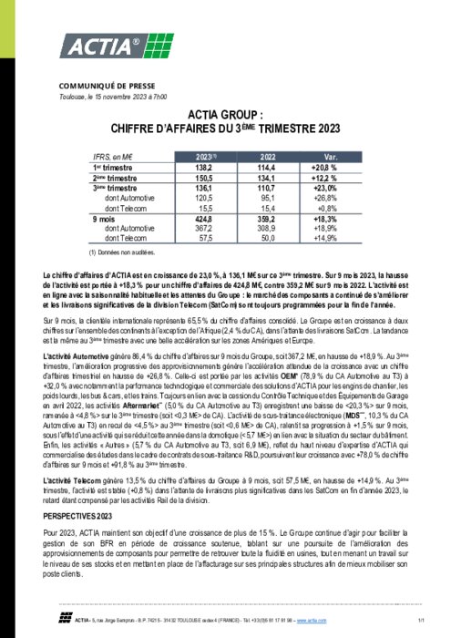 Le chiffre d’affaires d’ACTIA est en croissance de 23 %, à 136,1 M€ sur ce 3ème trimestre. Sur 9 mois 2023, la hausse