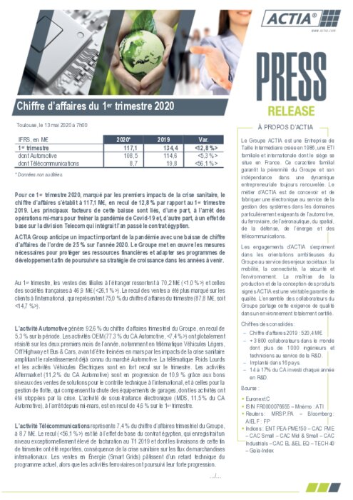 Pour ce 1er trimestre 2020, marqué par les premiers impacts de la crise sanitaire, le chiffre d’affaires s’établit à 117,1 M€, en recul de 12,8 % par rapport au 1er trimestre 2019. Les principaux facteurs de cette baisse sont liés, d’une part, à l’arrêt des opérations mi-mars pour freiner la pandémie de Covid-19 et, d’autre part, à un effet de base sur la division Telecom qui intégrait l’an passé le contrat égyptien.