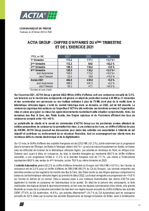 Sur l’exercice 2021, ACTIA Group a généré 462,8 M€ de chiffre d’affaires, soit une croissance annuelle de 5,5 %. Les tensions sur le marché des composants ont généré un retard de production évalué à 28 M€ au 31 décembre et des commandes non parvenues ou non traitées estimées à plus de 70 M€, dont plus de la moitié dans la télématique véhicules légers. L’arrêt du contrat historique dans ce domaine, en 2022, est de fait absorbé...