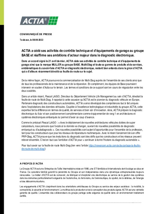 Dans un accord signé le 21 avril dernier, ACTIA cède ses activités de contrôle technique et d’équipements de garage ainsi que la marque MULLER au groupe BASE. Multi-Diag et toute sa gamme de produits et de services, emblématiques du savoir-faire d’ACTIA en diagnostic électronique, restent bien entendu dans le giron d’ACTIA qui a d’ailleurs récemment dévoilé sa feuille de route sur le sujet.