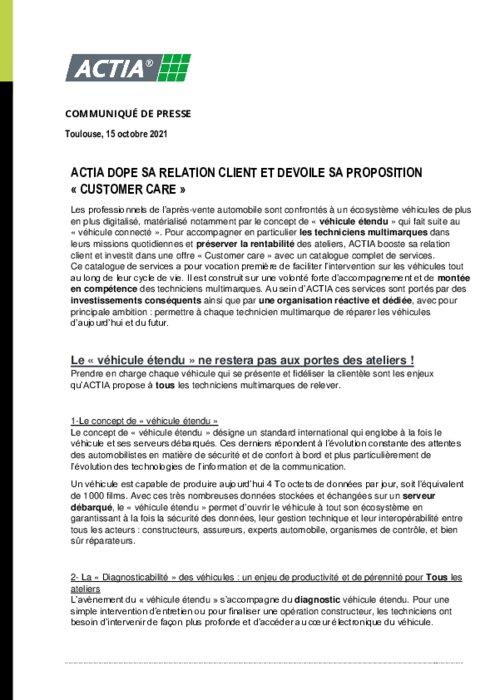 Les professionnels de l’après-vente automobile sont confrontés à un écosystème véhicules de plus en plus digitalisé, matérialisé notamment par le concept de « véhicule étendu » qui fait suite au « véhicule connecté ». Pour accompagner en particulier les techniciens multimarques dans leurs missions quotidiennes et préserver la rentabilité des ateliers, ACTIA booste sa relation client et investit dans une offre « Customer care » avec un catalogue complet de services.