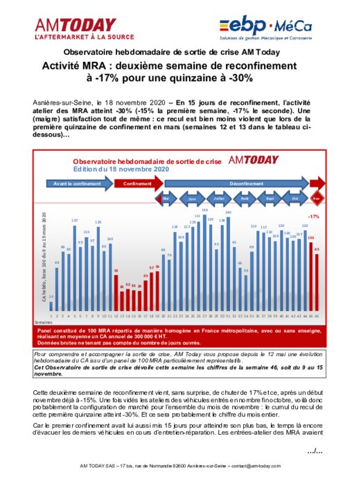Activité MRA : deuxième semaine de reconfinement à -17% pour une quinzaine à -30%