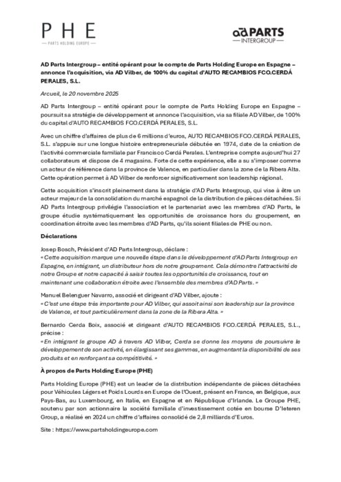 AD Parts Intergroup s'empare d’AUTO RECAMBIOS FCO.CERDÁ PERALES, S.L
