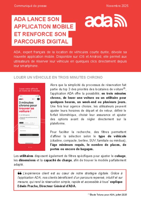 Alors que la simplicité du processus de réservation fait partie du top 3 des priorités des locataires de voiture l'application ADA offre la possibilité, en trois minutes chrono, de louer une voiture ou un utilitaire pour quelques heures, un week-end ou plusieurs jours. Une fois leur agence choisie, les utilisateurs peuvent ajuster leurs horaires de départ et de retour, définir le forfait kilométrique, choisir leur assurance et ajouter des options avant de régler directement sur la plateforme.
