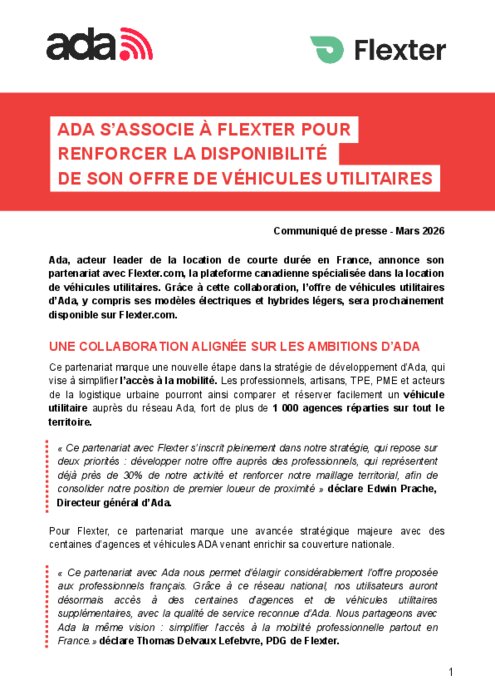 ADA, acteur leader de la location de courte durée en France, annonce un partenariat avec Flexter.com, spécialiste de la location de véhicules utilitaires. Grâce à cette collaboration, l’offre de véhicules utilitaires d’Ada, y compris ses modèles électriques et hybrides légers, sera disponible sur Flexter.com.