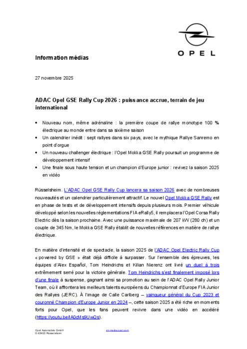 L’ADAC Opel GSE Rally Cup lancera sa saison 2026avec de nombreuses nouveautés et un calendrier particulièrement attractif. Le nouvel Opel Mokka GSE Rally est en phase de tests et de développement intensifs depuis plusieurs mois. Premier véhicule développé selon les nouvelles réglementations FIA eRally5, il remplacera l’Opel Corsa Rally Electric dès la saison prochaine. Avec une puissance maximale de 207 kW (280 ch) et un couple de 345 Nm, le Mokka GSE Rally établit de nouvelles références en matière de rallye électrique.