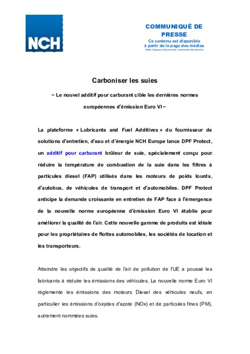 La plateforme " Lubricants and Fuel Additives " du fournisseur de solutions d'entretien, d'eau et d'énergie NCH Europe lance DPF Protect, un additif pour carburant brûleur de suie, spécialement conçu pour réduire la température de combustion de la suie dans les filtres à particules diesel (FAP) utilisés dans les moteurs de poids lourds, d'autobus, de véhicules de transport et d'automobiles.