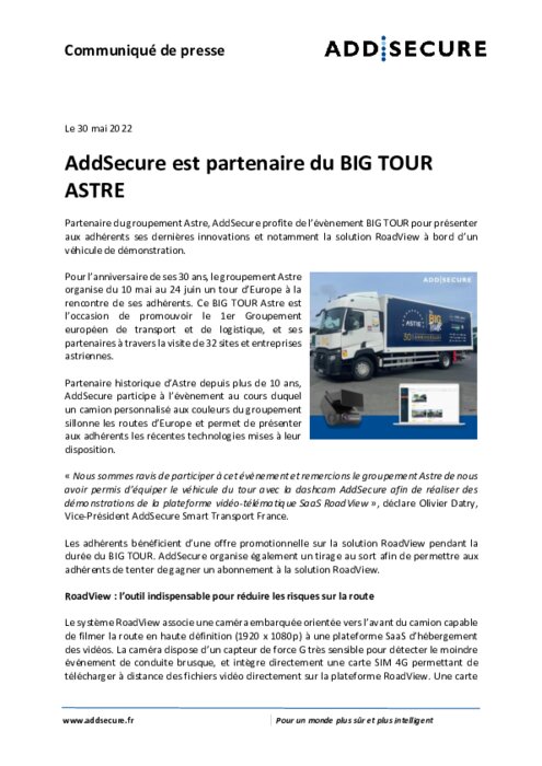 Pour l’anniversaire de ses 30 ans, le groupement Astre organise du 10 mai au 24 juin un tour d’Europe à la rencontre de ses adhérents. Ce BIG TOUR Astre est l’occasion de promouvoir le 1er Groupement européen de transport et de logistique, et ses partenaires à travers la visite de 32 sites et entreprises astriennes.