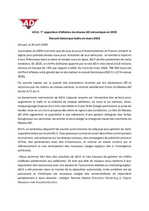 AD.fr, 1er apporteur d’affaires du réseau AD mécanique en 2025