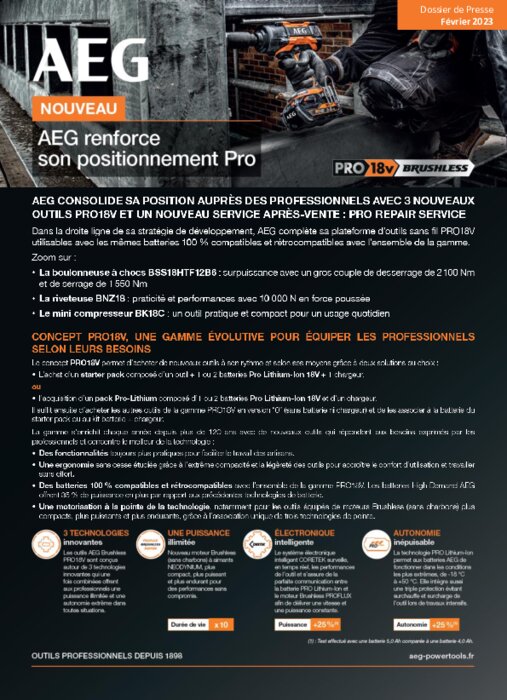 Equipementiers 22 mars 2023 - 10:18 Dans la droite ligne de sa stratégie de développement, AEG complète sa plateforme d’outils sans fil PRO18V utilisables avec les mêmes batteries 100 % compatibles et rétrocompatibles avec l’ensemble de la gamme. PDF (2 Mo) Télécharger