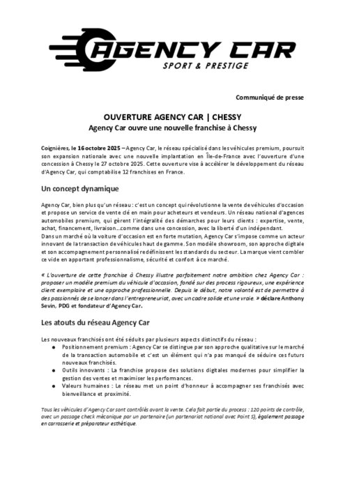 Agency Car, le réseau spécialisé dans les véhicules premium, poursuit son expansion nationale avec une nouvelle implantation en Île-de-France avec l’ouverture d’une concession à Chessy aujourd’hui. Cette ouverture vise à accélérer le développement du réseau d’Agency Car, qui comptabilise 12 franchises en France.