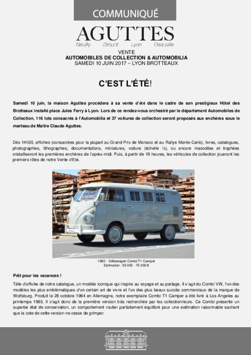 Samedi 10 juin, la maison Aguttes procédera à sa vente d’été dans le cadre de son prestigieux Hôtel des Brotteaux installé place Jules Ferry à Lyon. Lors de ce rendez-vous orchestré par le département Automobiles de Collection, 116 lots consacrés à l’Automobilia et 37 voitures de collection seront proposés aux enchères sous le marteau de Maître Claude Aguttes.