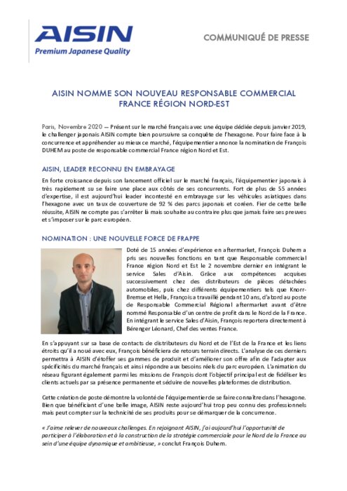 Présent sur le marché français avec une équipe dédiée depuis janvier 2019, le challenger japonais AISIN compte bien poursuivre sa conquête de l'hexagone. Pour faire face à la concurrence et appréhender au mieux ce marché, l'équipementier annonce la nomination de François DUHEM au poste de responsable commercial France région Nord et Est.