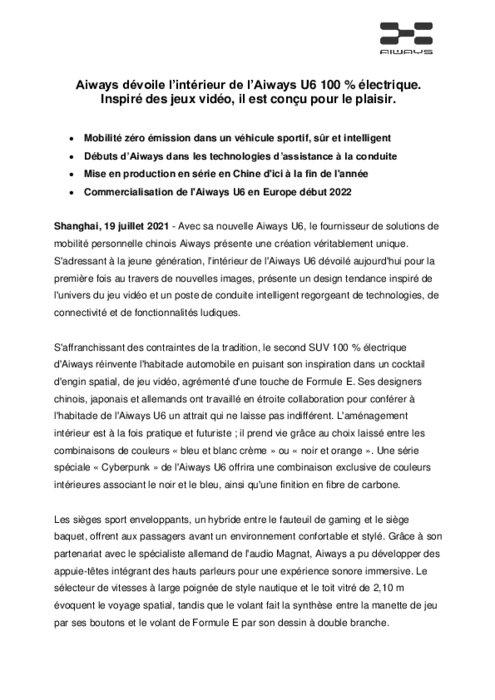 Avec sa nouvelle Aiways U6, le fournisseur de solutions de mobilité personnelle chinois Aiways présente une création véritablement unique. S'adressant à la jeune génération, l'intérieur de l'Aiways U6 dévoilé aujourd'hui pour la première fois au travers de nouvelles images, présente un design tendance inspiré de l'univers du jeu vidéo et un poste de conduite intelligent regorgeant de technologies, de connectivité et de fonctionnalités ludiques.