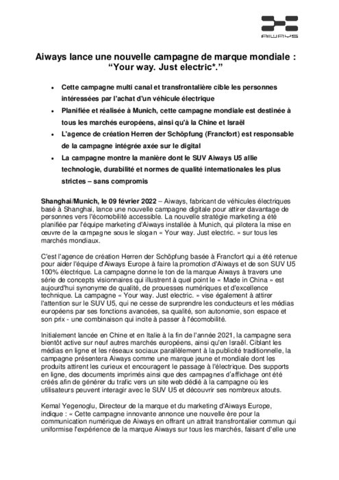 Aiways, fabricant de véhicules électriques basé à Shanghai, lance une nouvelle campagne digitale pour attirer davantage de personnes vers l'écomobilité accessible. La nouvelle stratégie marketing a été planifiée par l'équipe marketing d'Aiways installée à Munich, qui pilotera la mise en œuvre de la campagne sous le slogan « Your way. Just electric. » sur tous les marchés mondiaux.
