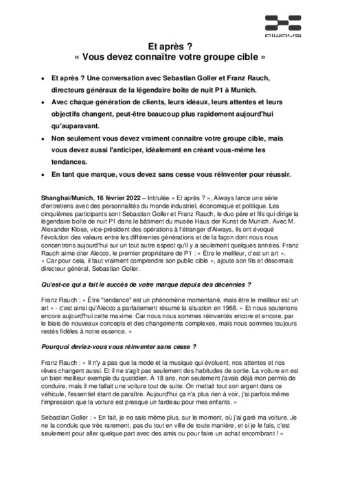 Intitulée « Et après ? », Aiways lance une série d'entretiens avec des personnalités du monde industriel, économique et politique. Les cinquièmes participants sont Sebastian Goller et Franz Rauch, le duo père et fils qui dirige la légendaire boîte de nuit P1 dans le bâtiment du musée Haus der Kunst de Munich. Avec M. Alexander Klose, vice-président des opérations à l'étranger d'Aiways, ils ont évoqué l'évolution des valeurs entre les différentes générations...