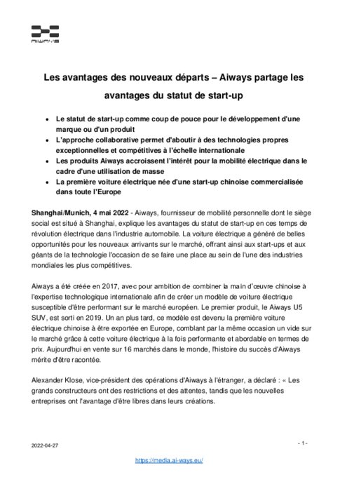 Aiways partage les avantages du statut de start-up