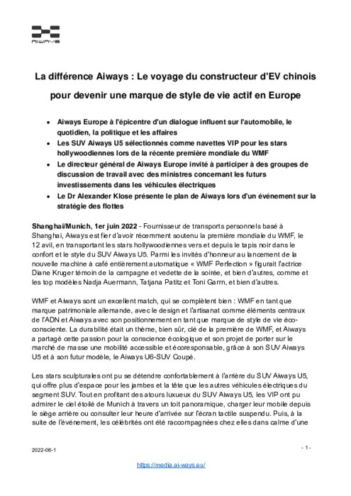 Fournisseur de transports personnels basé à Shanghai, Aiways est fier d'avoir récemment soutenu la première mondiale du WMF, le 12 avil, en transportant les stars hollywoodiennes vers et depuis le tapis noir dans le confort et le style du SUV Aiways U5. Parmi les invités d'honneur au lancement de la nouvelle machine à café entièrement automatique « WMF Perfection » figurait l'actrice Diane Kruger témoin de la campagne et vedette de la soirée