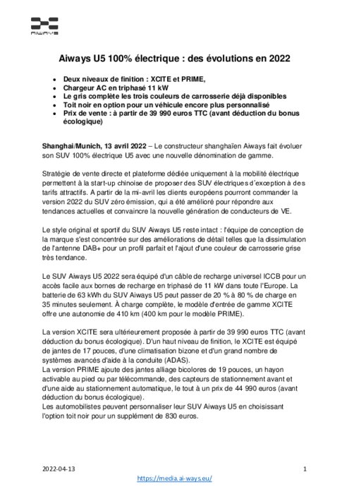 Le constructeur shanghaïen Aiways fait évoluer son SUV 100% électrique U5 avec une nouvelle dénomination de gamme. Stratégie de vente directe et plateforme dédiée uniquement à la mobilité électrique permettent à la start-up chinoise de proposer des SUV électriques d’exception à des tarifs attractifs. A partir de la mi-avril les clients européens pourront commander la version 2022 du SUV zéro émission, qui a été amélioré pour répondre aux tendances actuelles et convaincre la nouvelle génération.