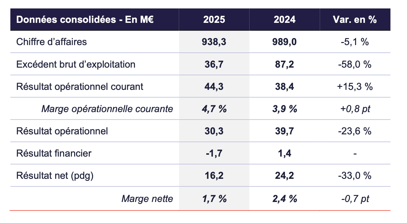 AKWEL, équipementier-systémier pour l’industrie automobile et poids lourd, spécialiste du management des fluides, des mécanismes et des pièces de structure des véhicules électriques, annonce un chiffre d’affaires 2025 consolidé de 938,3 M€, en retrait de -5,1 % , une baisse comparable en EMEA (-5,4 %), sur le continent américain (-4,1 %) et en Asie (-7,3 %). Si L’EBE est en baisse de -58 %, est impacté par le solde du litige client sur les réservoirs SCR, le résultat opérationnel courant s’affiche ainsi en progression de +15,3 % à 44,3 M€, soit une marge opérationnelle courante de 4,7 % du chiffre d’affaires, en hausse de +0,8 point.